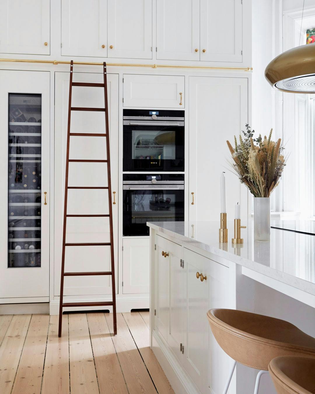 I højloftede rum bliver pladsen udnyttet optimalt med skabe, der er så høje som mulig. En stige er en sjov detalje, men er også en praktisk løsning, der giver nem adgang til de høje overskabe. Selve køkkenet er fra Kvänum, barstole fra Hay og lysestager fra Fritz Hansen. Vase fra Excell.
