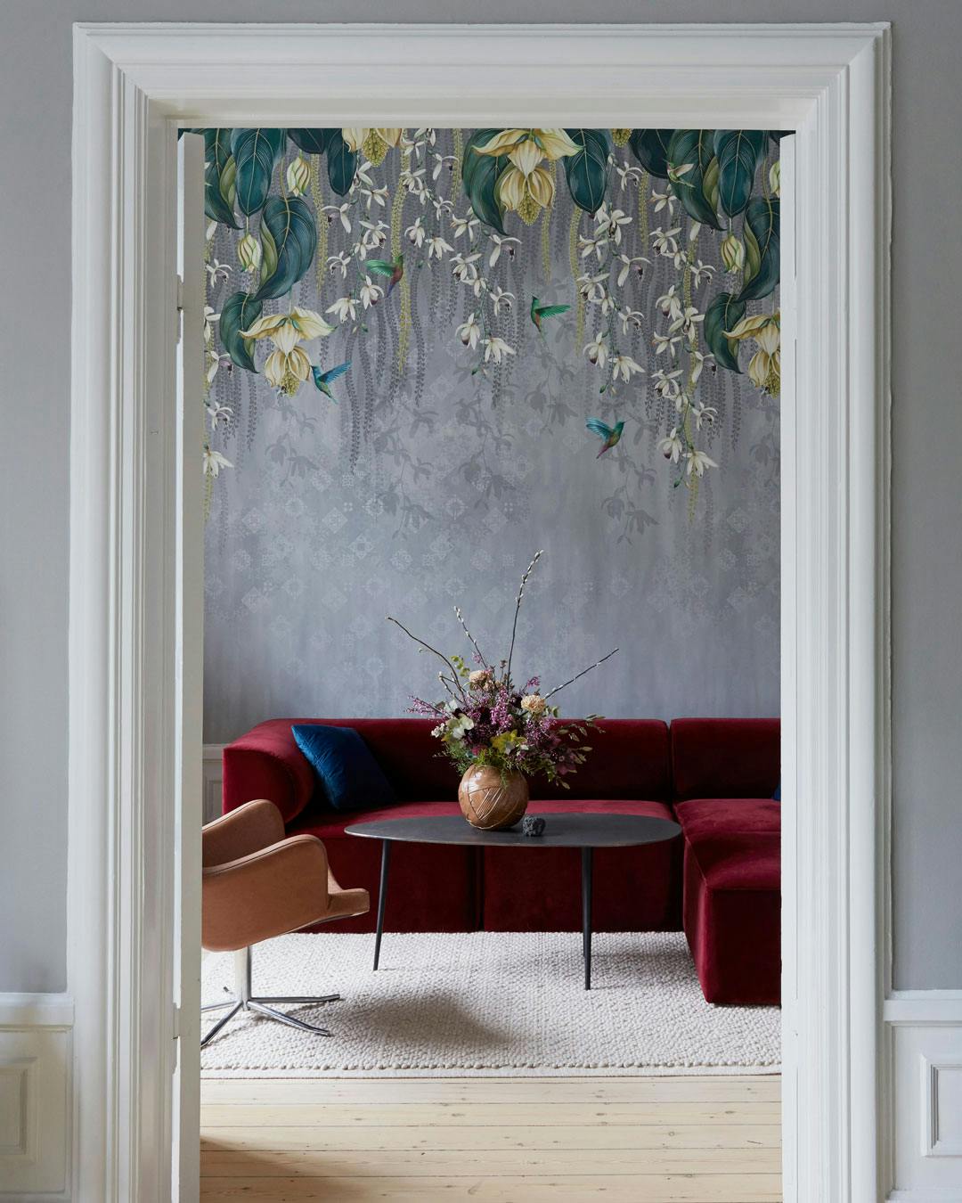Den røde sofa fra Menu skaber blikfang og bryder med de øvrige farver i rummet, mens det blomstrede tapet fra Osborne & Little komplimenteres af friske blomster bundet af Blooming.