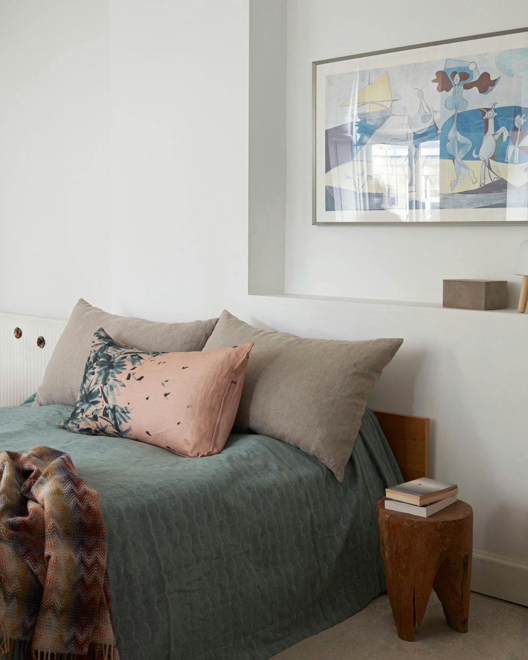 Tekstiler som sengetæpper, plaider og puder giver et sanseligt udtryk i soveværelset. Miks gerne forskellige mønstre og strukturer for at få et mere unikt udtryk. Her er det puder fra Living Plus og Society, sengetæppe fra Georg Jensen og plaid fra Missoni. Natbord fra Illums Bolighus, og print af kunstværket ”Joie de vivre” af Picasso.