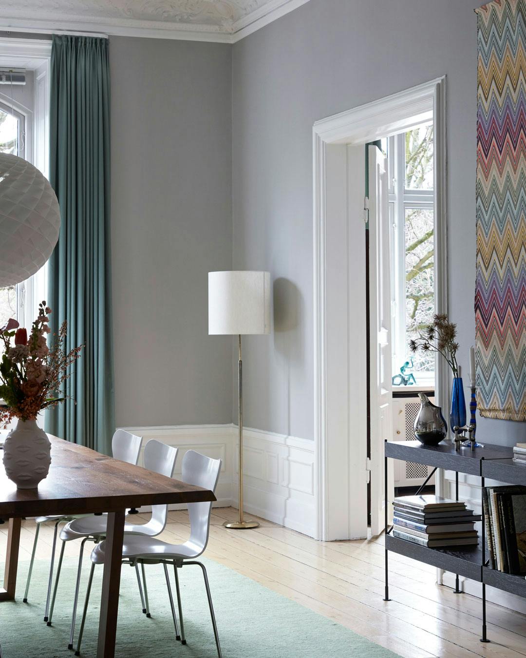 Mens stuens tapet tilføjer et naturalistisk motiv, har parret valgt et grafisk og farverigt tema i spisestuen, hvor væggene først har fået en varmgrå farve som bund. Her hænger et stort Missoni-tæppe med farver, der spænder fra lysegul over grøn til mørkelilla.