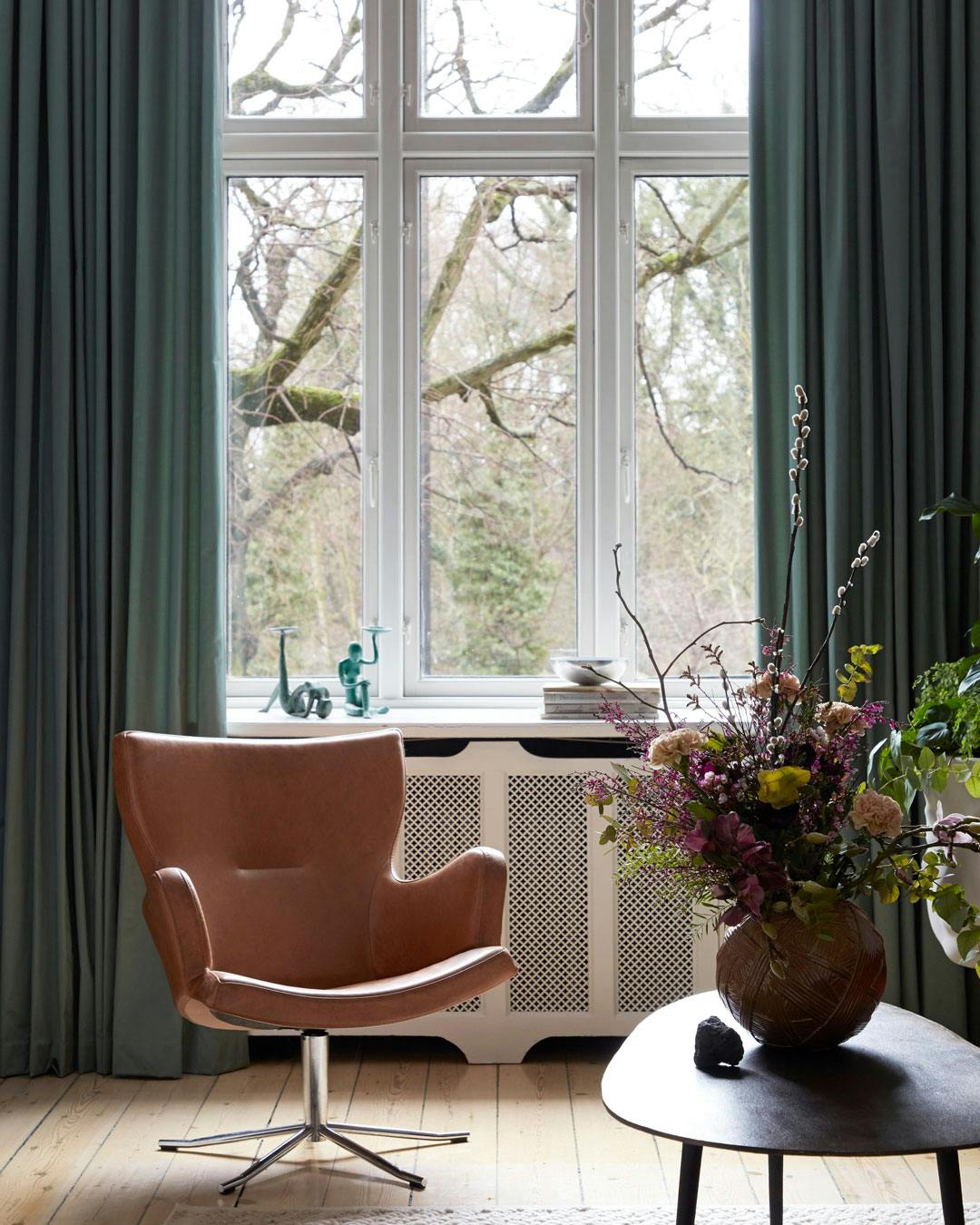 Gardiner giver hjemmet en taktil følelse, og vælger du gardiner, der går fra gulv til loft, ser rummet længere ud. Lænestol fra Conform og gardiner fra Living Plus. Sofabord fra Muubs og vase fra Missoni.
