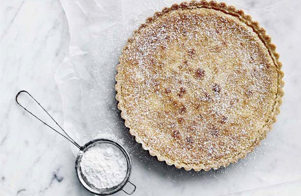 Rør smør og sukker sammen. Tilsæt mandelmel og æggene. Pisk, indtil blandingen er let og ensartet. Tilsæt majsstivelse og til sidst calvados og piskefløde. Forvarm ovnen til 210°. Fyld den forbagte tærtebund med mandelcremen, og bag tærten i ovnen i ca. 30 minutter eller indtil tærten er mørkt gylden. Lad tærten afkøle i formen. Server tærten, som den er, eller med denne skønne æblekaramel: