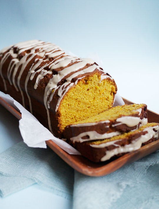 3. Pisk smør, æg og begge slags sukker sammen til en blød og luftig masse. Rør græskarmosen i og vend mel, bagepulver og krydderier i dejen. Sørg for at røre dejen, så den er helt jævn uden melklumper, men uden at dejen bliver rørt alt for længe. Hæld dejen i den klargjorte form og kom kagen i ovnen. Bages i ca 60 min. Lad kagen køle af. Rør en glasur af ahornsirup og flormelis og glaser kagen, når den er helt kold.