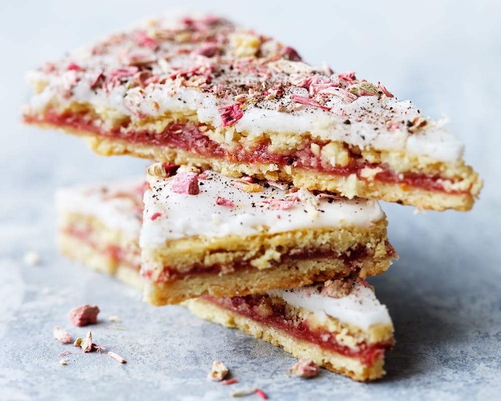 4. Glasur: Rør flormelis, smør og citronsaft (lidt ad gangen, så glasuren ikke bliver for tynd) sammen til en tyk glasur, og smør den jævnt ud på den endnu lune kage. Drys straks med frysetørrede rabarber og lakridspulver. Skær kagen ud i snitter, når glasuren er størknet. Opbevar dem i en tætsluttende beholder ved stuetemperatur, hvis de ikke bliver spist med det samme.