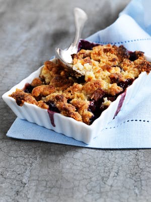 Crumblecake er en skøn dessert, som du kan lave ud af forskellige frugter alt efter, hvad du lige har i køleskabet, eller hvilke bær/frugter du foretrækker. Denne crumblecake med pære og blåbær giver en god blanding af det sure og søde, og så er den nem at lave, hvis du får gæster til kaffe.