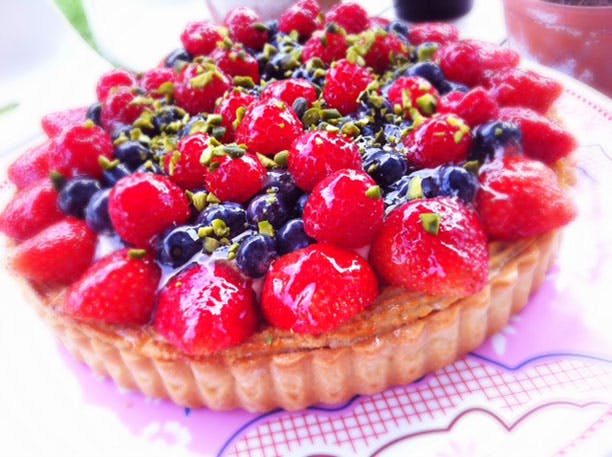 Tærten pyntes med friske jordbær, blåbær og hindbær og glaseres med hyldeblomstgeléen, som pensles på. Drys med hakkede pistaciennødder for at få en flot kontrast til de røde bær.