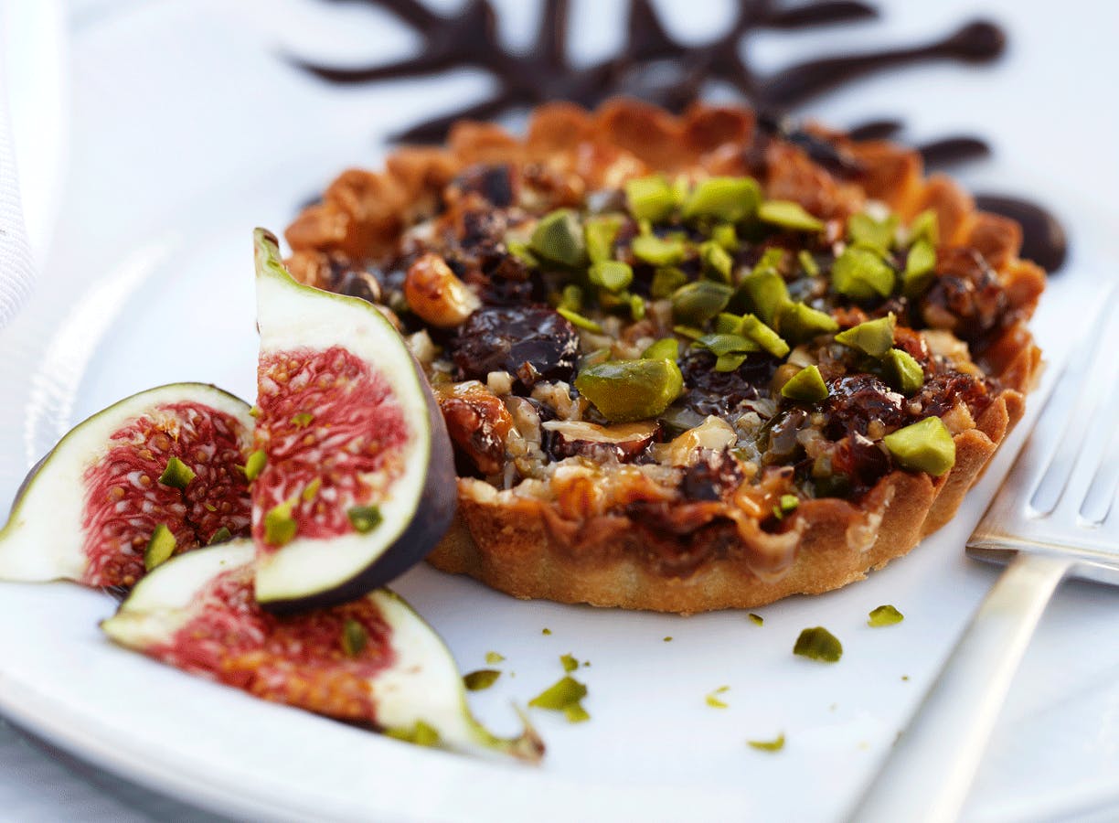 - Bag tærten i 10-15 min. på 190° og lad den køle af på en bagerist. Pynt med smeltet chokolade og hakkede pisctacienødder. Server med friske figner.