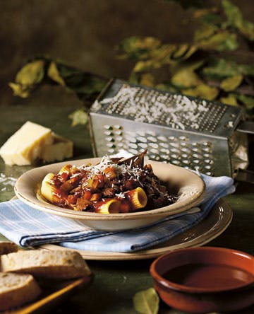 Anret den kogte pasta med det braiserede kød og sauce i varme dybe tallerkener. Server med revet parmesan og brød.