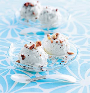 Skræl æblerne, fjern kernehuset og skær dem i mindre stykker. Kog æbler, vand og sukker ved svag varme til de er møre. Blend og køl æblemosen af. Pisk æggeblommer, sukker og vaniljekorn til en luftig masse og vend den kolde æblemos i. Tilsæt citronsaft. Pisk fløden stiv og vend den forsigtigt i. Hæld ismassen i en form på ca. 1½ liter og frys den i 3-4 timer. Rør isen igennem flere gange under indfrysningen. Rist mandlerne gyldne på en pande. Køl dem af, hak groft og drys på isen, der gerne må tø op en times tid inden skal den serveres, blød og cremet.