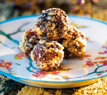 Kør valnødderne i en foodprocessor til de danner en tyk masse. Tilsæt rom og rør nøddeblandingen sammen med marcipan. Del marcipanmassen op i lige store stykker og tril dem til kugler. Dyp i smeltet mørk chokolade og rul dem i finthakkede valnødder.
