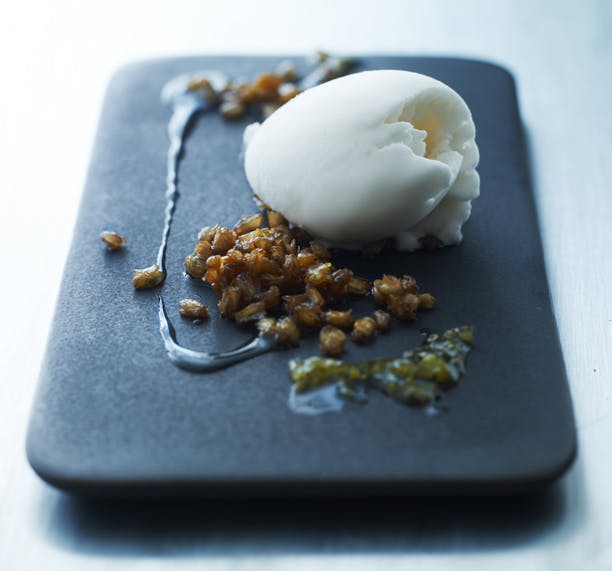 Pres saften af den anden citron og smag lagen til med den. Køl af, sigt og kør væsken på ismaskinen eller hæld den i en skål og sæt den i fryseren.