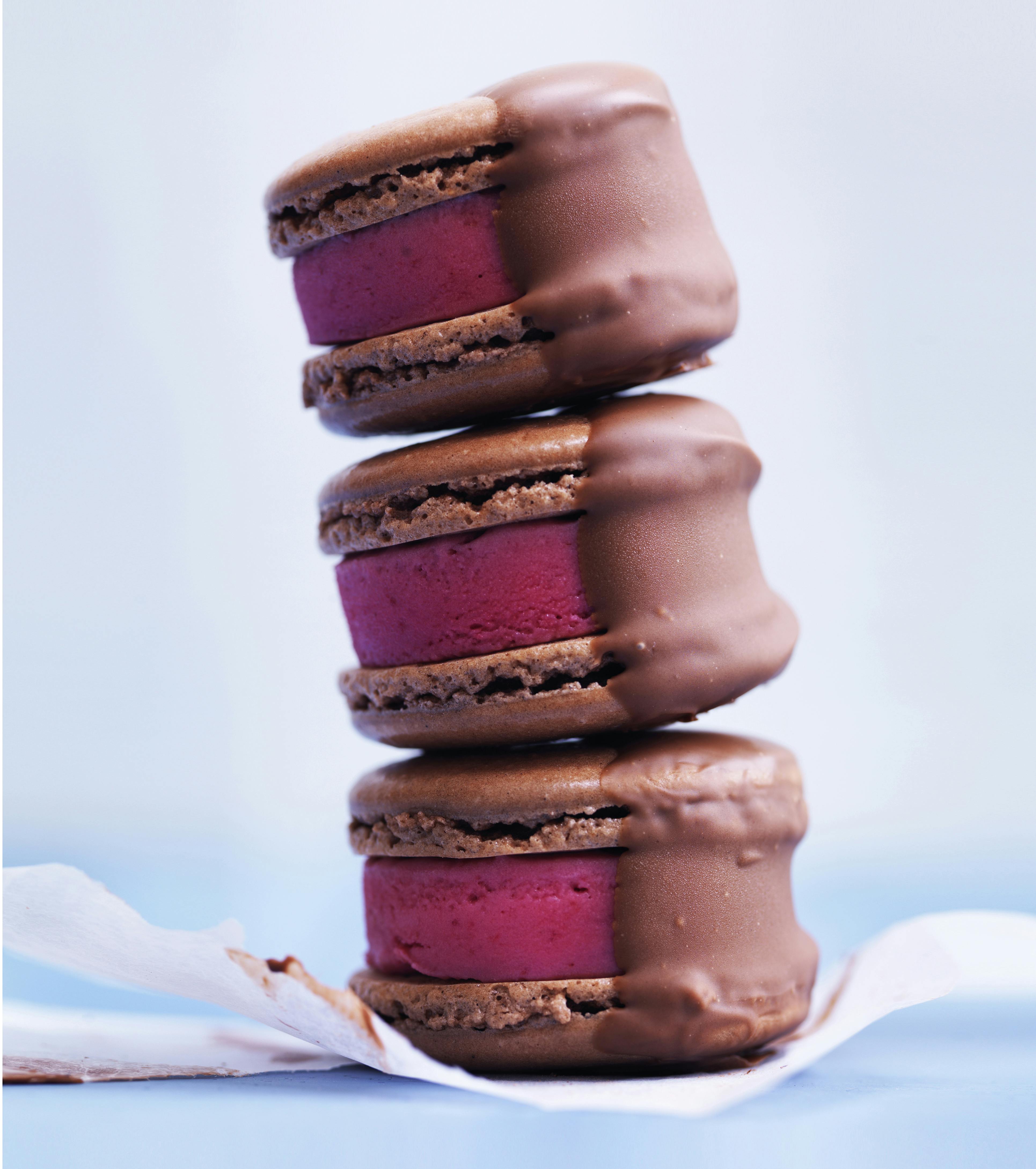 Sommer er istid - hjemmelavet istid. I denne dessert får vores yndlingsis selskab af små, fine macarons og mørk chokolade. Haps!