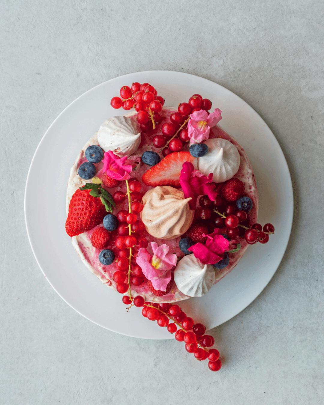 Servér denne overdådige islagkage for dine gæster, den er fyldt med vanilje, hindbærd, jordbær kys og blomster. Få opskriften her!