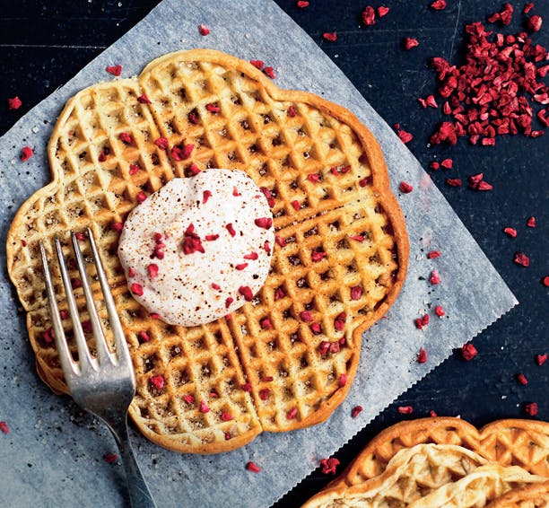 3. Rør sukker og lakridspulver sammen. Server vaflerne varme toppet med skyr, lakridssukker og frysetørrede hindbær.