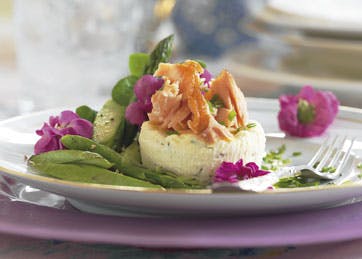 Lav først dressingen. Blend purløg med olivenolie, lad olien trække 1 times tid, og hæld den gennem en sigte. Rør ricotta, æg og parmesan sammen, tilsæt hvidløg og krydderurter, og smag til med salt og peber. Fordel ricottamassen i 4 velsmurte aluforme (muffinforme) på ca. 1½ dl, og bag dem i ovnen ved 225° i ca. 20 min., til de er gyldne, faste og har hævet. Lad dem derefter afkøle - de vil falde en smule sammen. Skær laksen i grove stykker. Snit aspargeserne i lange stykker på skrå, og rist dem 2-3 min. i lidt olivenolie. Vend den bagte ricotta ud af formene, pynt med asparges, laks og stedmoderblomster, og dryp purløgsolie over.