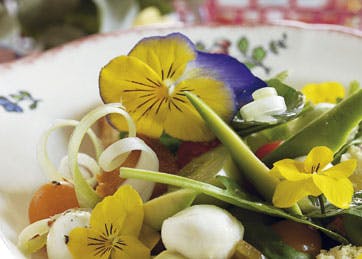 Tip! Minimozzarella kan købes i de fleste større supermarkeder, eller du kan bruge de almindelige og skære dem i den facon, du ønsker. Du kan også bruge stedmoderblomster i stedet for hornviol.
