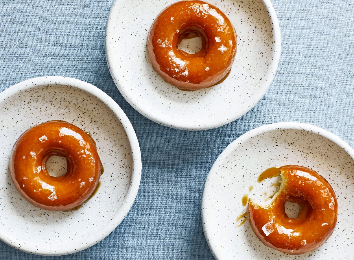 Det gør dog ikke smagen af disse donuts mindre syndig, for de er overtrukket med en snasket karamelglaze med havsalt. Prøv den overraskende nemme opskrift på overdådige hjemmelavede donuts herunder.