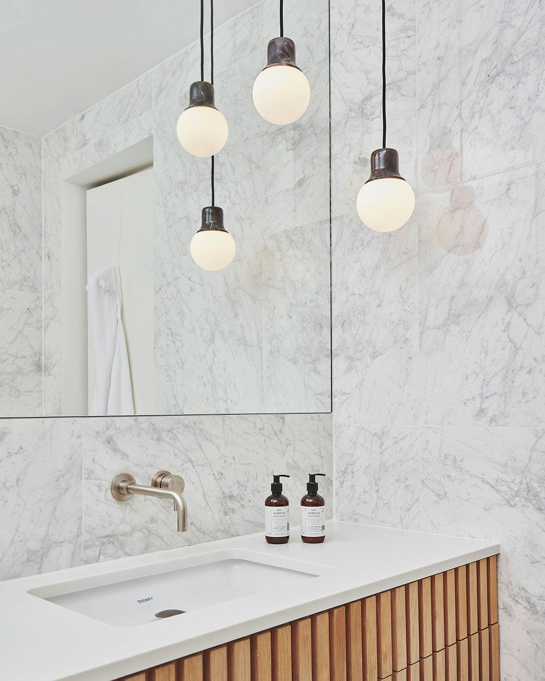 Sørg for, at spejlet ikke er bredere end møblet under. Og hvis det er, så sørg for, at det flugter med et andet møbel på badeværelset, f.eks. toilettet. Det vil give dig det mest balancerede udtryk.
