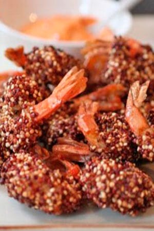 Læg quinoa-rejerne på bagepladen, mens du forvarmer olien i en tykbundet gryde. Varm 4-5 centimeter olie ved middel-varme, og steg rejerne i 3 minutter. Tag derefter rejerne op og læg dem tilbage på viskestykket til afdrypning.