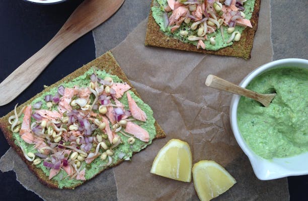 Smør et tykt lag ærtecreme ud på broccolibunden, fordel plukket laks lidt over det hele, drys med bønnespirer, rødløg og giv pizzaen et drys peber.