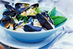 - Anret muslinger og grønsager i dybe tallerkner og hæld saucen over. Pynt med hakket fennikeltop. Server godt brød til.