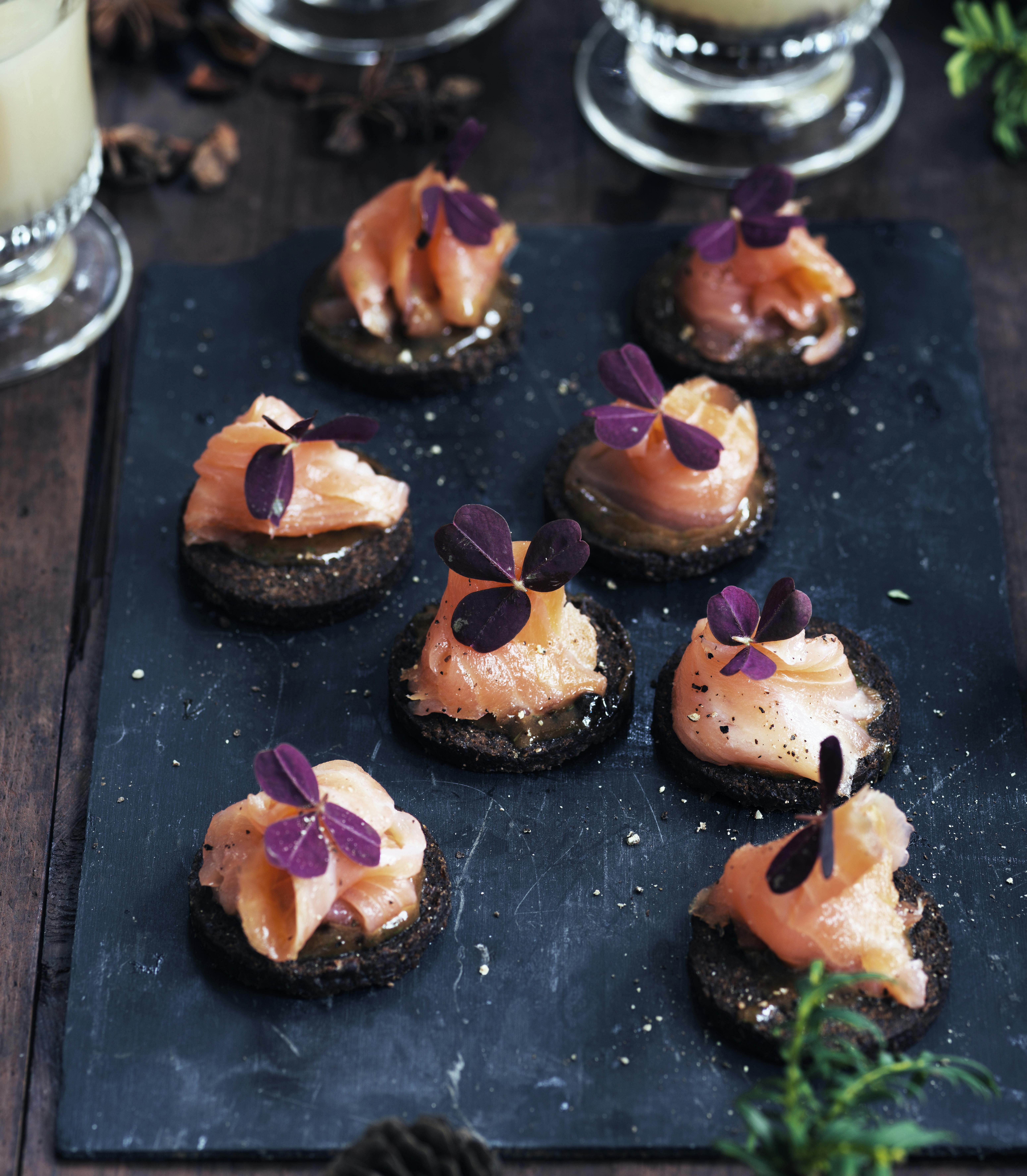 Tip: Hvis du er i tidsnød eller synes, det er mere passende til forretten, kan du evt. bruge knækbrød til denne lille hapser i stedet for pumpernikkel. Dette gør retten endnu hurtigere og nemmere at lave, og knækbrøddet har en mere luftig, let og knasende fornemmelse.