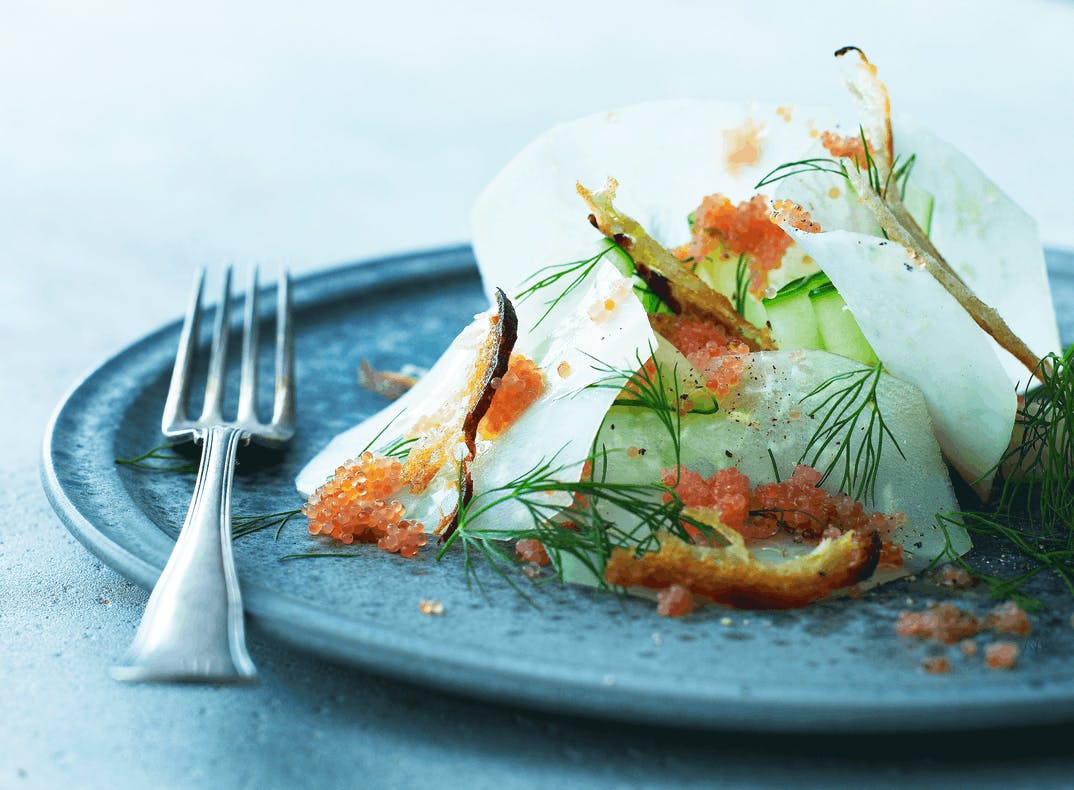 Prøv stenbiderrogn med salat af glaskålm agurk, dild og sprøde brød - perfekt til forretten! (link fjernet)