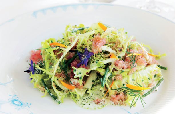 Vend de vilde urter, stenbiderrognen, salatenog mormordressingen sammen i en skål, og anret derefter i fire dybe tallerkener. Pynt med lidt ekstra rogn, urter og dild på toppen og hæld lidt mere mormordressing og dildolie over til allersidst.