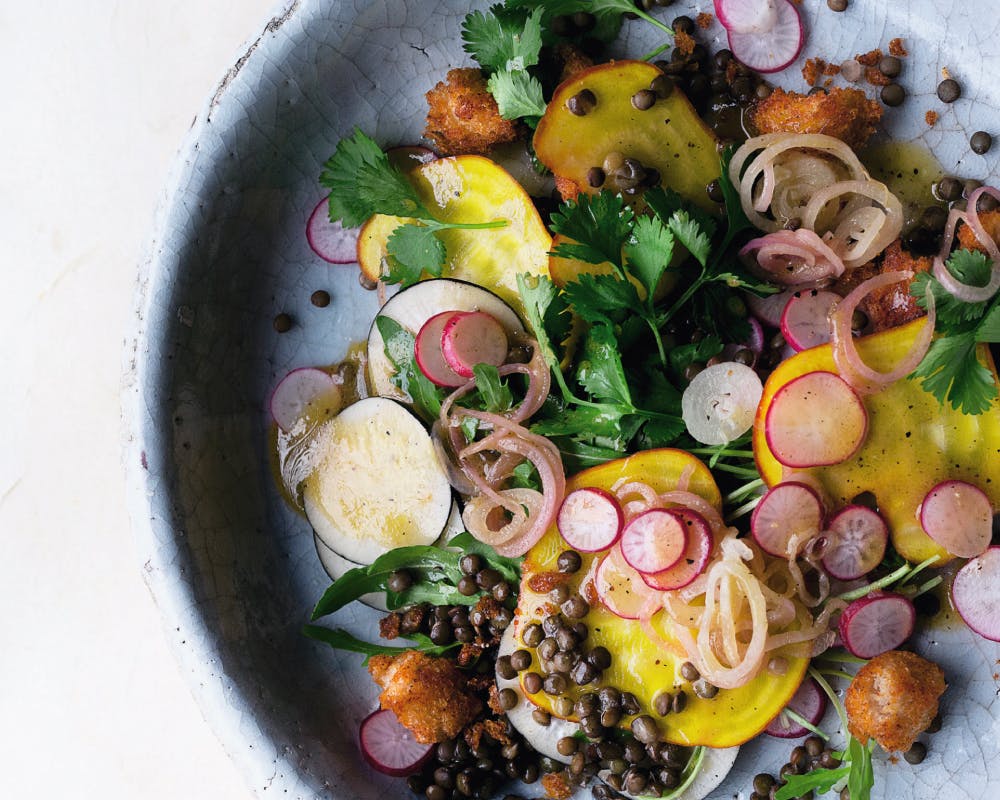 6. Kom linserne i en stor skål lige inden servering, og tilføj de syltede skalotteløg, koriander, rucola, rødbede, ræddike, radiser og halvdelen af croutonerne. Hæld dressingen over, vend grundigt rundt, anret salaten, drys med de resterende croutoner.