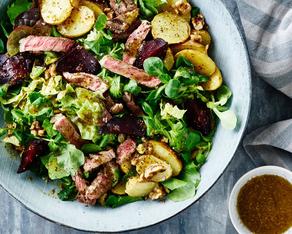 Sennepsdressing: Rør sennep sammen med honning og balsamico. Rør olie i, lidt ad gangen. Krydr med salt og peber. Steg bøfferne i lidt olie på en (grill)pande i ca. 3 minutter. Skær dem i skiver, og anret dem oven på salaten sammen med rødbeder og kartofler. Hæld sennepsdressing over salaten, og servér.