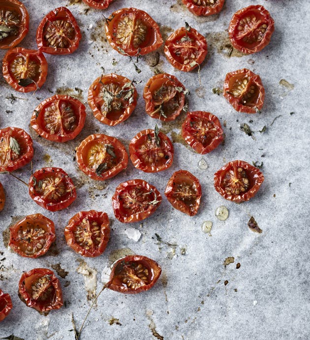 Ovntørrede tomater er supernemme at lave, og du kan i virkeligheden tilsætte præcis de krydderurter, som du godt kan lide. Prøv for eksempel ovntørrede tomater med hakket rosmarin drysset hen over - det smager fortryllende.