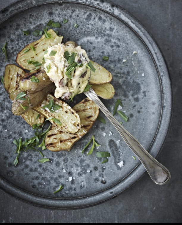 Grillede kartofler: Vask kartoflerne grundigt, og kom dem i en gryde sammen med laurbærblade, salt og vand, og bring i kog. Kog kartoflerne i 8-10 minutter, og tag så gryden af varmen, men lad kartoflerne stå i vandet og trække i 8-10 minutter, til de er færdigkogte. Hæld vandet fra kartoflerne, og halver dem. Vend med olivenolie og lidt salt. Varm en grillpande op, og grill kartoflerne på begge sider, så de bliver sprøde og får et flot grillmønster. Server kartoflerne med det kolde smør til en god bøf eller et grillet kyllingebryst.