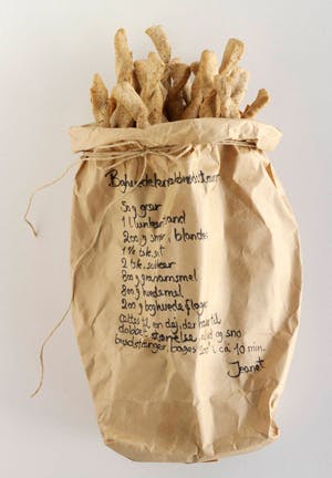 Køb lidt ind hos din grønthandel og gem de brune poser. Fold kanten lidt ned, skriv opskriften på posen med en flot og tydelig håndskrift, vikel snor om posen, med en lille sløjfe foran.