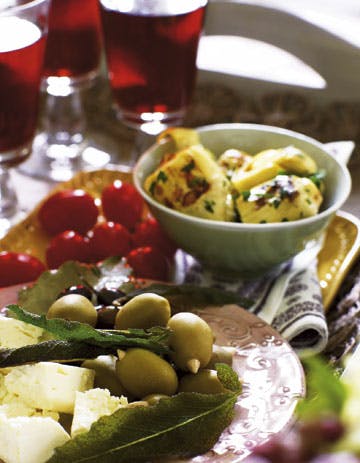 Opvarm olivenolien på en pande. Steg salviebladene sprøde. Lad dem dryppe af på et stykke køkkenrulle. Grill artiskokhjerterne på en hed grillpande i rapskimolie. Skyl og hak persillen. Vend artiskokhjerterne i persillen. Anret artiskokhjerter, oliven, daddeltomater og feta på et fad sammen med den sprødstegte salvie. Læg servietter og tandstikkere ved siden af til at tage med.
