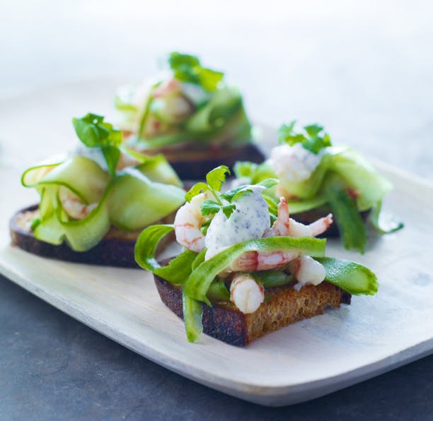 Fordel rejeblandingen på de ristede brød, top med dressing, og pynt med lidt selleriurt eller bredbladet persille. Så har du skønne bruschettas til dine gæster.