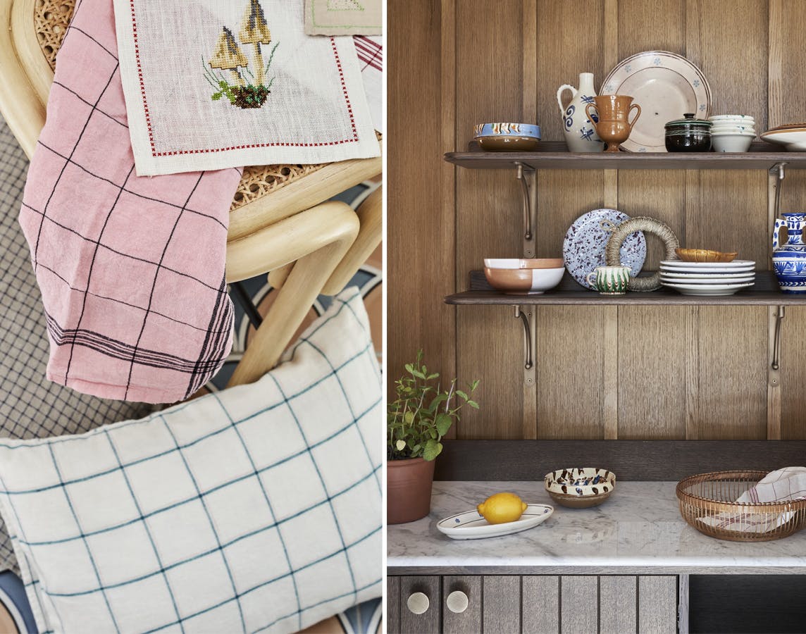 Pude og viskestykker fra Shop Dora. Det lille broderi med svampe er et loppefund.