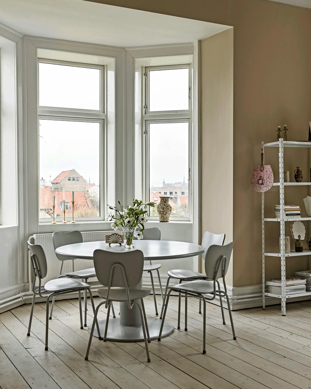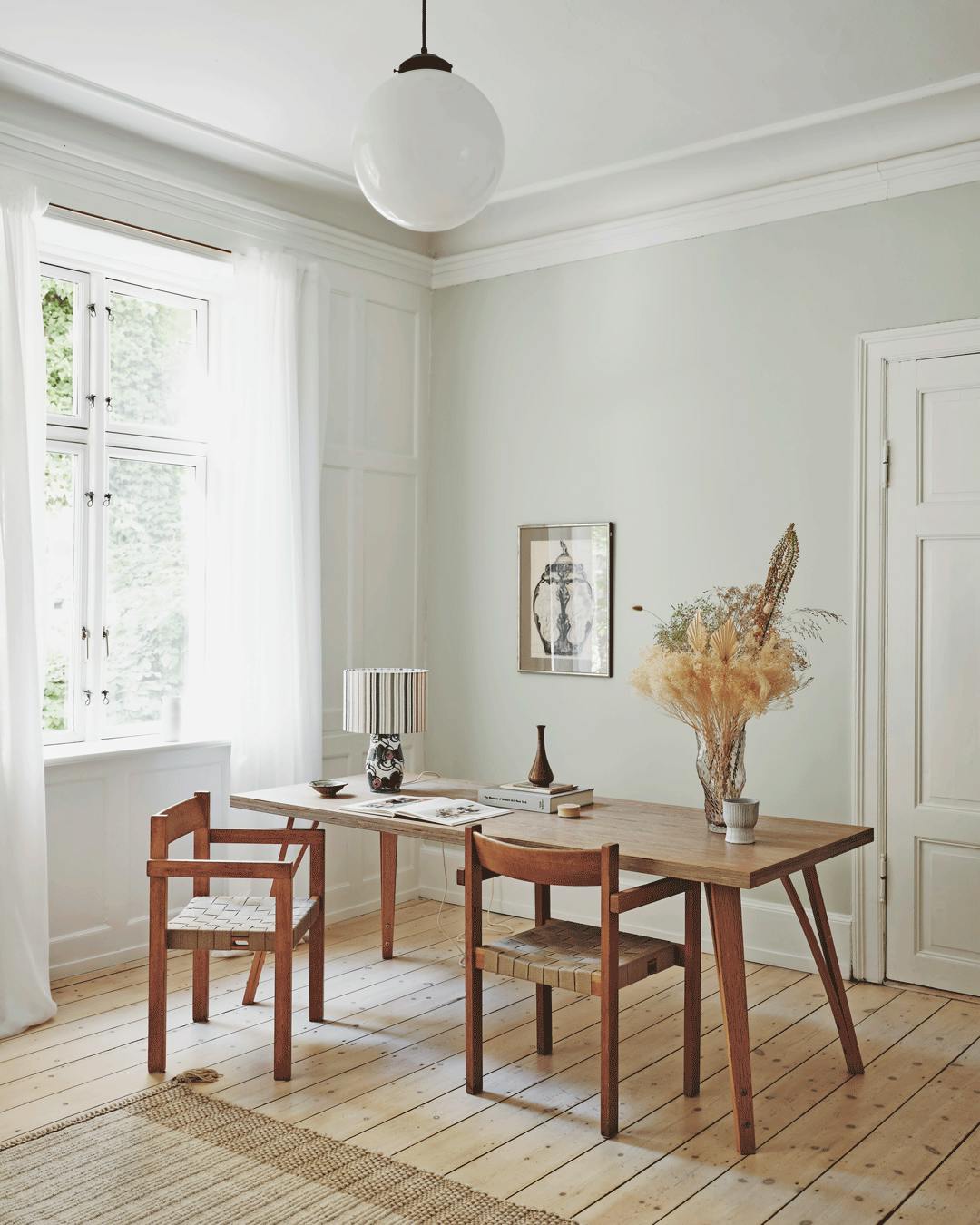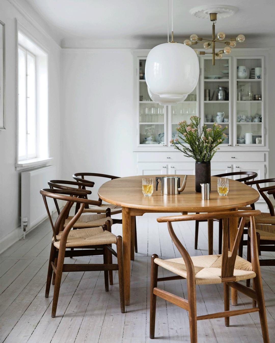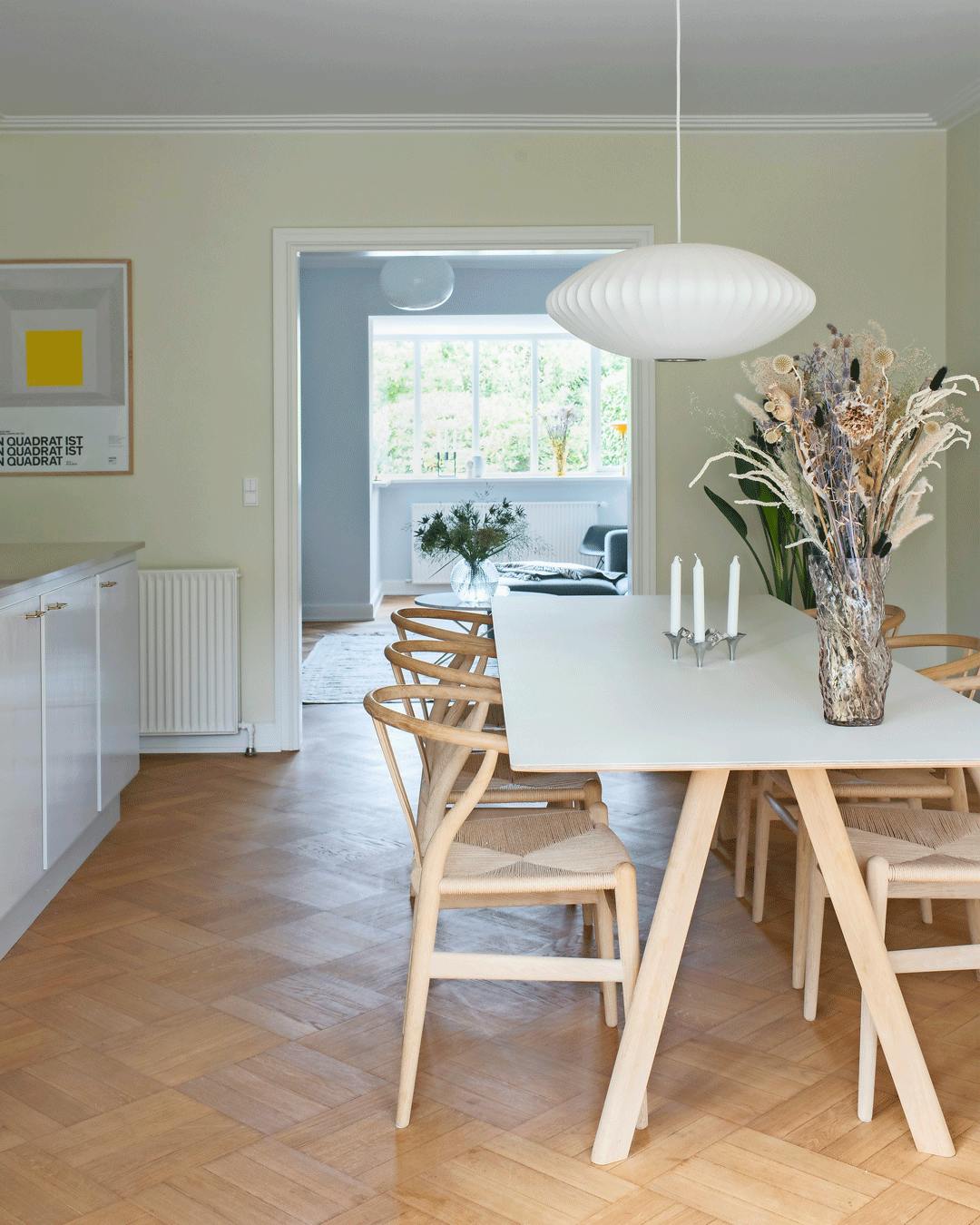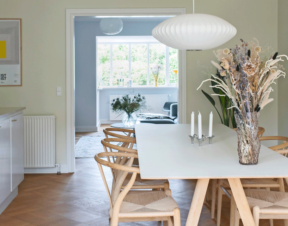 Bring masser af lys ind i din spisestue med lyse farver og toner. Buketten er fra Stalks & Roots og vasen fra svenske Eightmood. Pendlen er designet af George Nelson, og plakaten er fundet hos Stilleben. Spisebordet er et CPH30 fra Hay, og stolene er Wegners Y-stole.