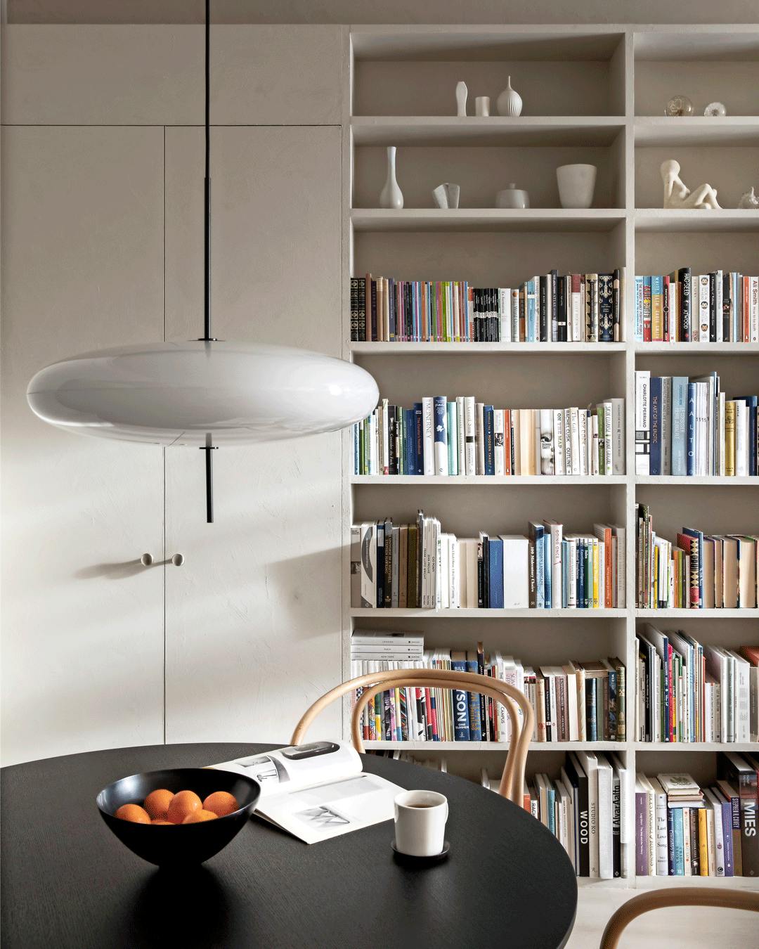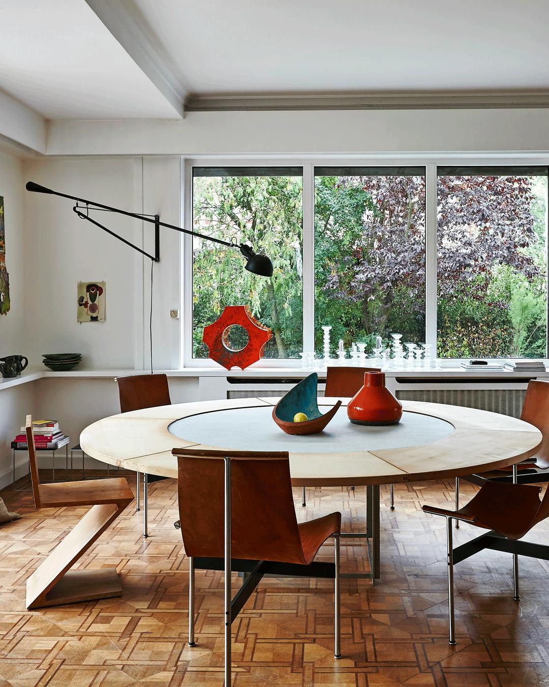 Udstil din kunstsamling i spisestuen. Hvis du har et stort rundt spisebord, er det oplagt at bruge midten til udstilling af kunstobjekter. Omkring spisebordet står T-stolene fra 1952, der er designet af William Katavolos, Douglas Kelly og Ross Littell og både er en del af MoMAs og Louvres faste samlinger.