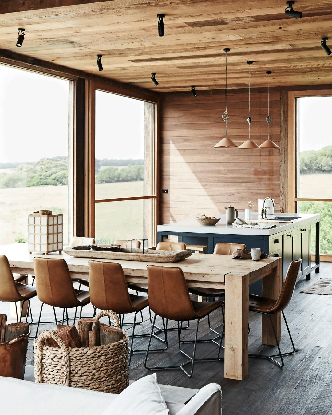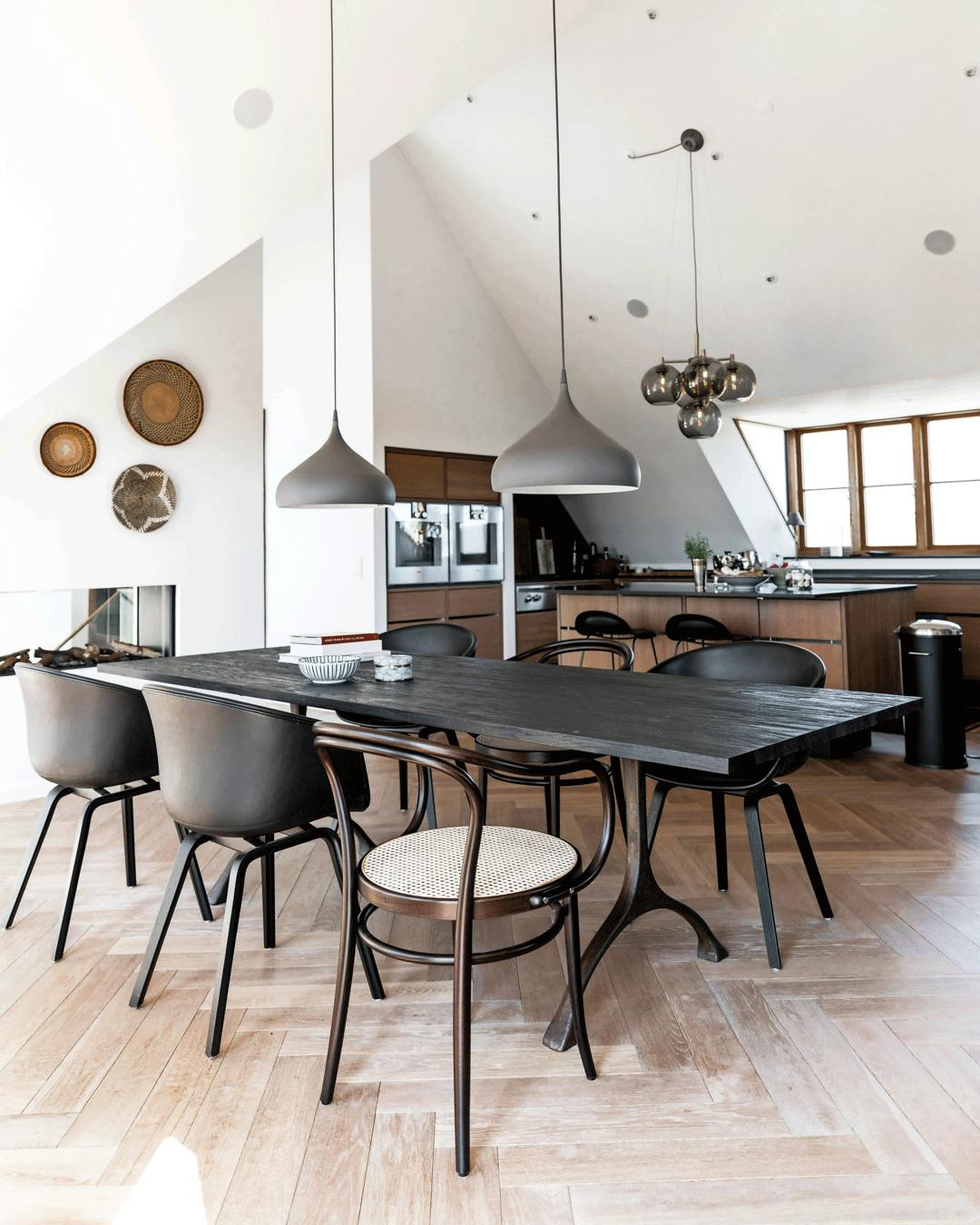 Et køkken alrum er en god idé, hvis du stadig vil være med i samtalerne ved bordet, selvom du står i køkkenet. Træ i forskellige sorter er med til at give en naturlig og varm atmosfære og kan bryde et ellers klinisk udtryk. Stolene er en blanding fra Hay og Thonet, og lampen over bordet er fra &Tradition. De runde kurve på endevæggen over pejsen stammer fra Mallorca.