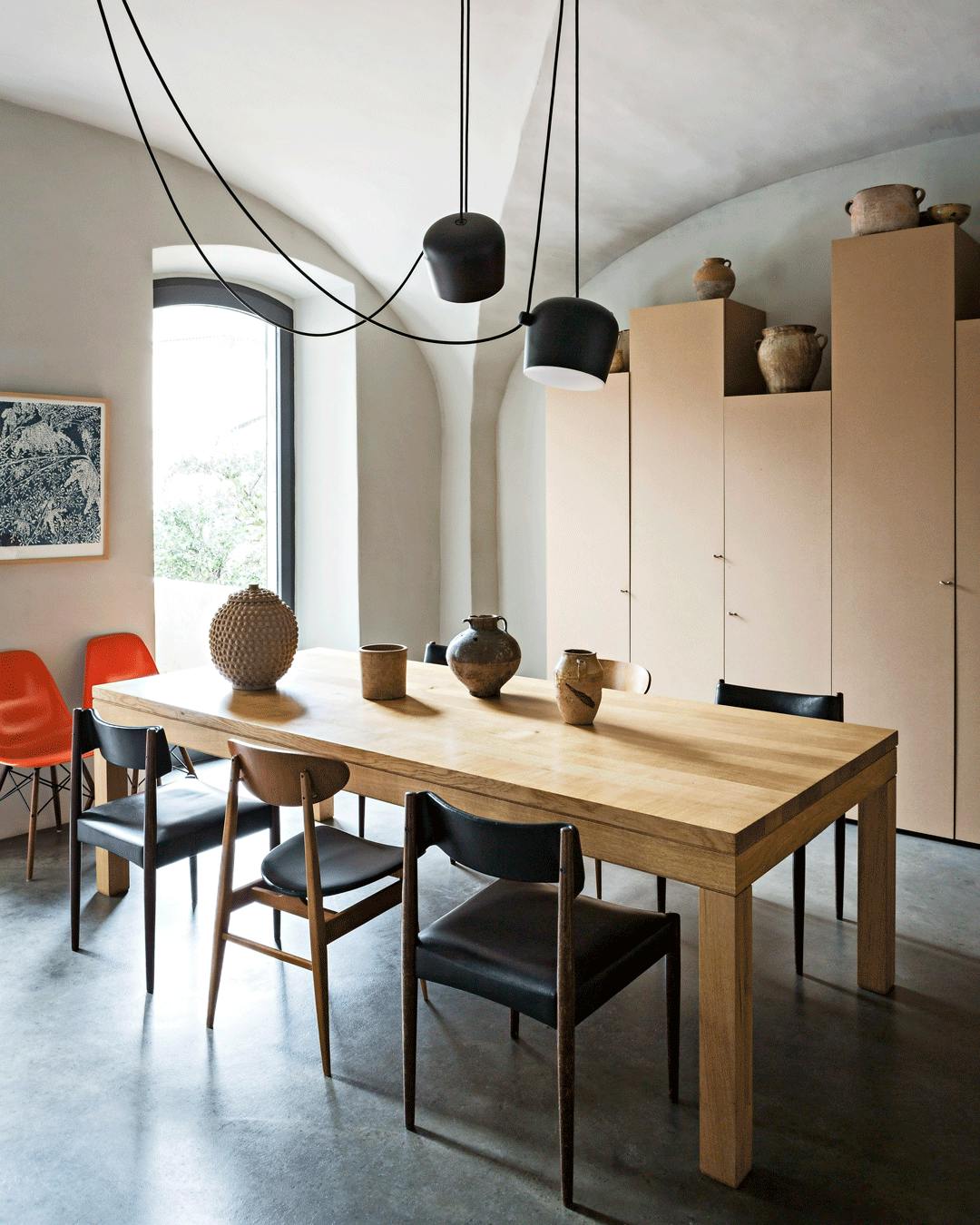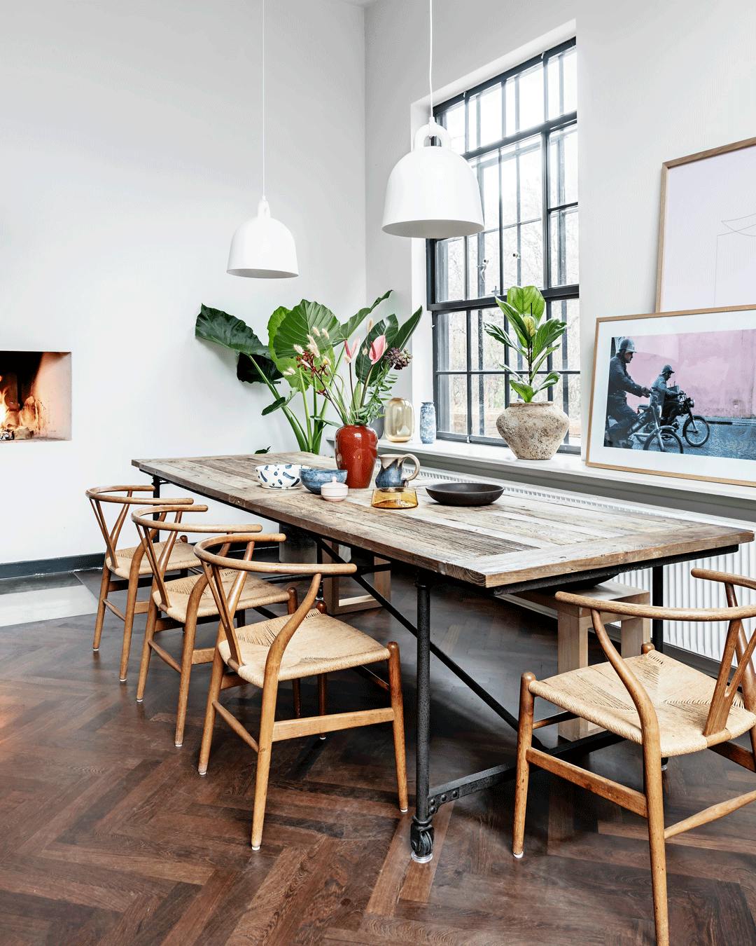 Giv din spisestue karakter med industrielle og rå møbler, der spiller godt sammen med klassisk design. Bordet er fra Restoration Hardware, og stolene er Wegners Y-stole. Lamperne er fra Normann Copenhagen, mens krukken med en violinfigen i vinduet er fra Muubs. Fotokunsten er fra Kayser-o.com og Poster & Frame, mens keramikken og skålene på bordet er en blanding af loppefund og ting fra Stilleben.