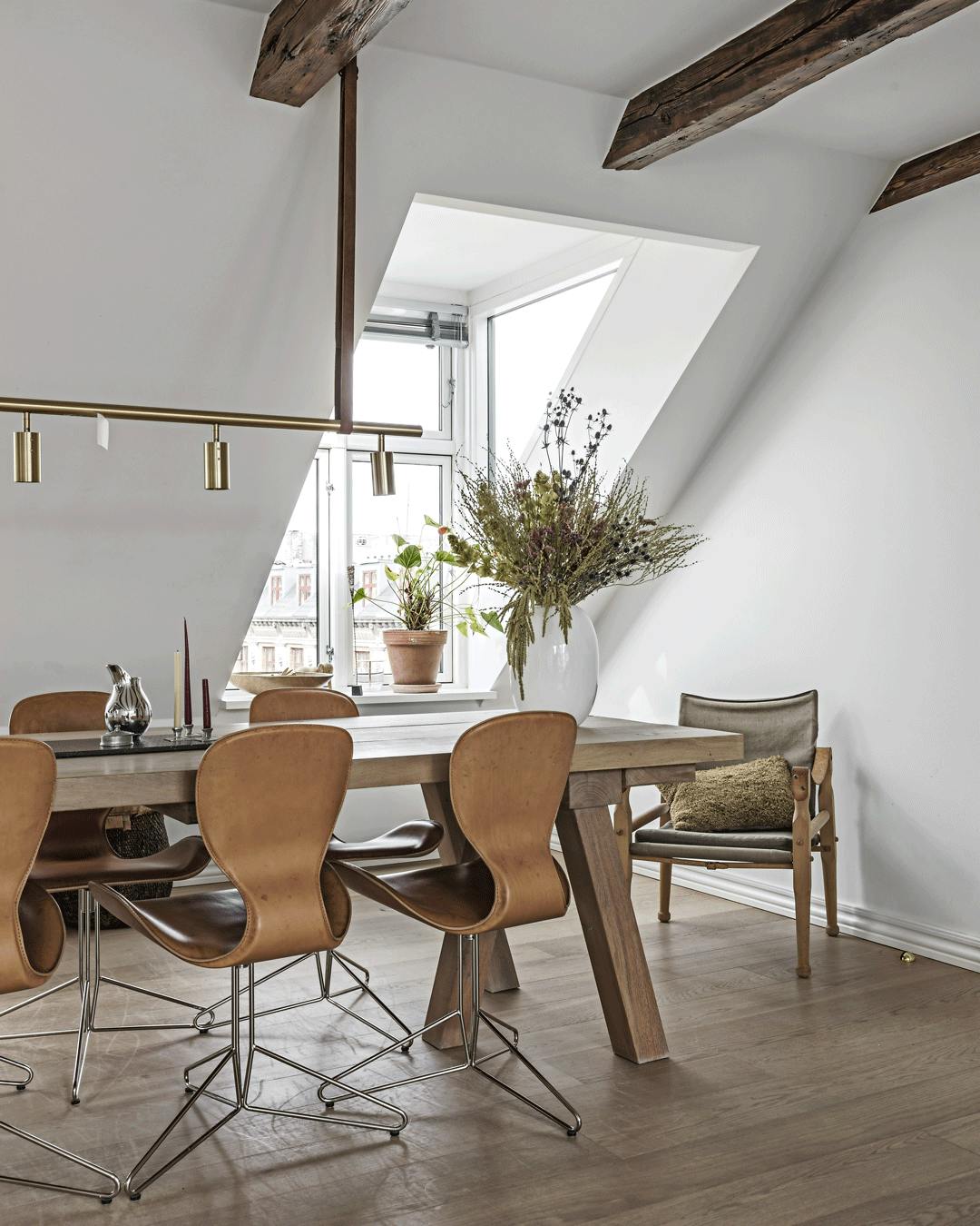 Bland træ og læder med stål og messing, hvis du vil give de varme naturmaterialer et køligt og elegant modspil. Plankebordet er fra St-Paul Home og købt i Casa Shop. Spisebordsstolene i læder er Koi K2 fra engelske Koi, og lampen over spisebordet er en Long John designet af Niclas Hoflin for Rubn.