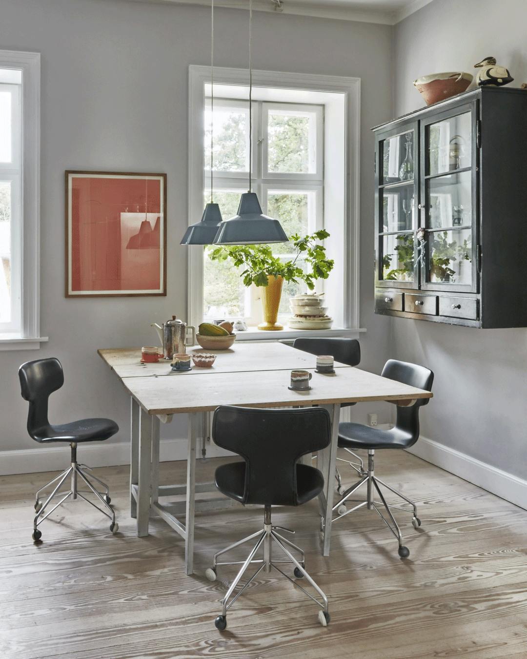 Her er en spisestue, der er fyldt med dansk design. Bordet og stolene er designet af Wegner, lamperne er Radiohuspendlen fra Louis Poulsen, tekanden er designet af Arne Jacobsen, og skabet er lavet af en snedker.