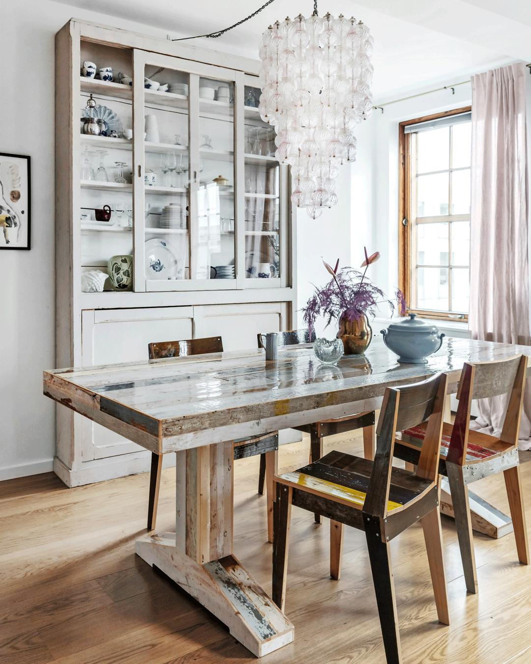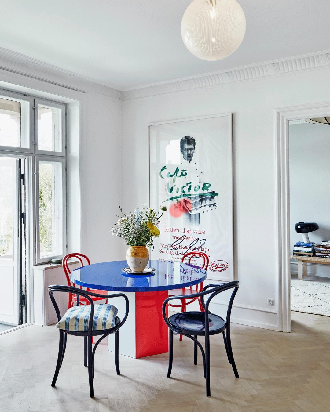 Giv din spisestue en wow-effekt med pangfarver. Bordet her er hjemmelavet, stolene er oprindeligt fra Thonet, og Murano-lampen er fundet via Lauritz.com.