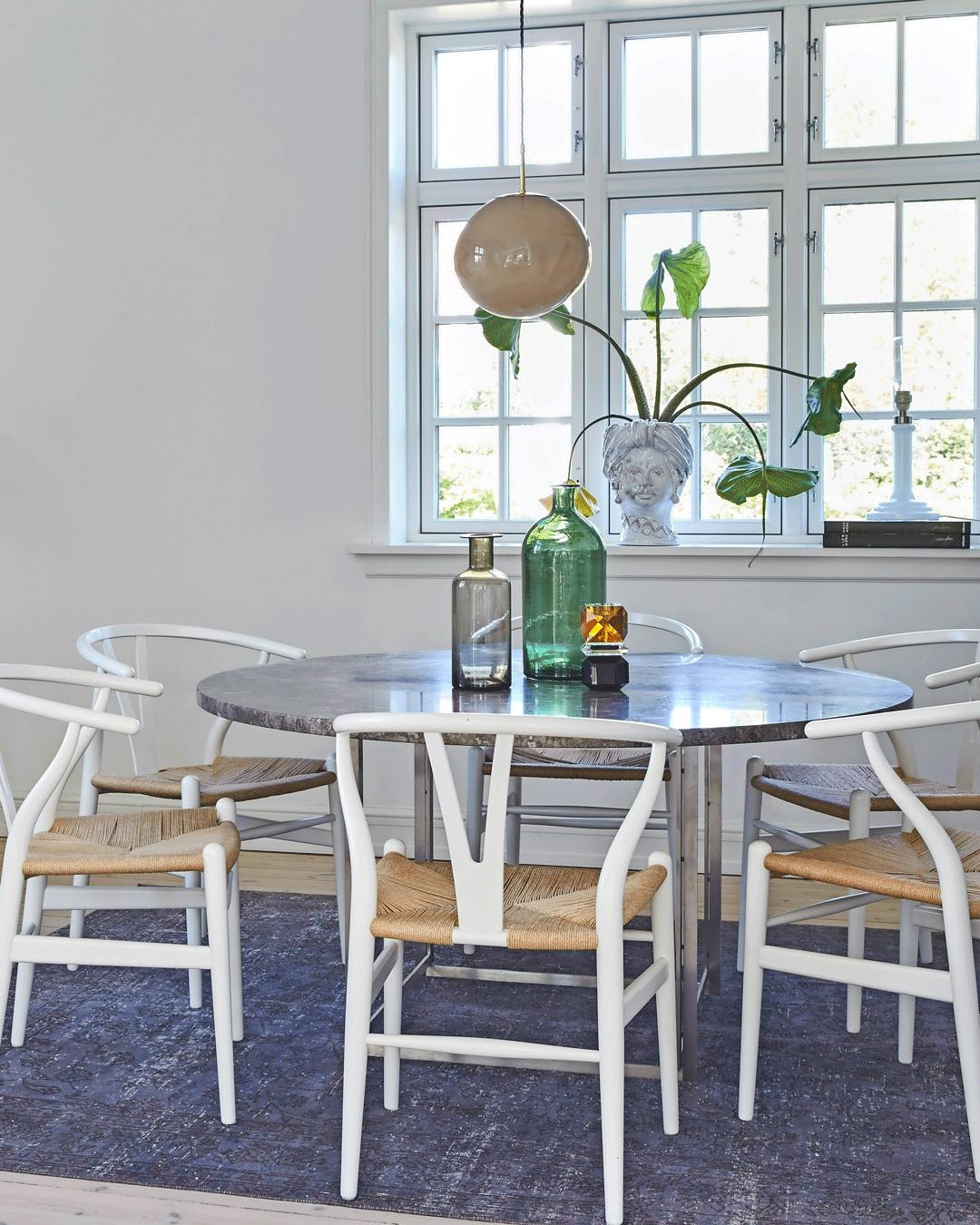 En hvid spisestue med de ikoniske Y-stole i hvid. Spisebordet er designet af Poul Kjærholm og stolene af Wegner. På spisebordet ses to store flasker, som begge er loppefund, og en lille krystallysestage fra Reflections Copenhagen. Vasen i vinduet er fra Giacomo Alessi Ceramiche købt hos De Fire Årstider.