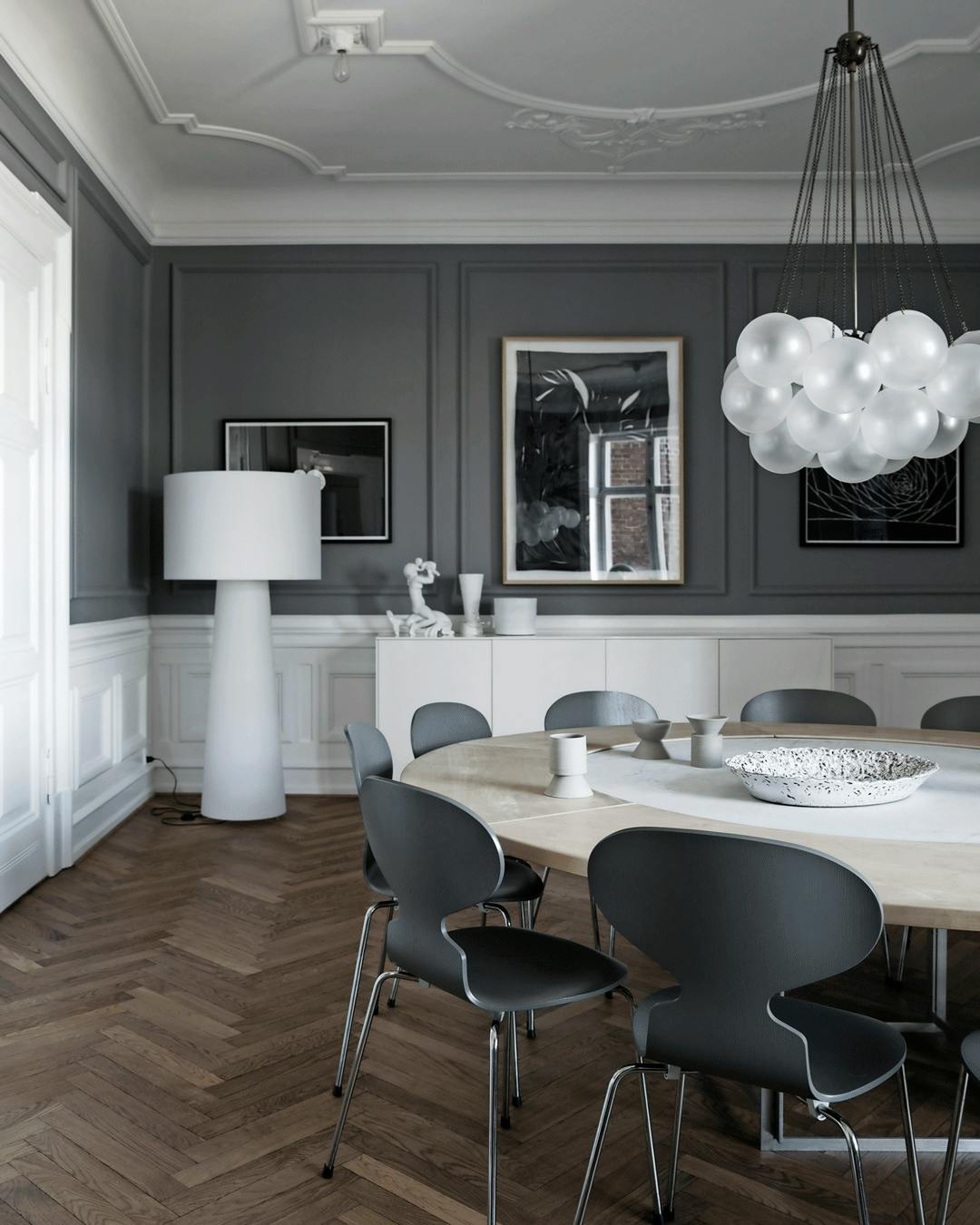 Vælger du lamper i et opsigtsvækkende design, kan de fungere som kunstobjekter såsom Cloud-lamperne fra Apparatus hos Oliver Gustav Studio og standerlampen Big Shadow PO fra Cappellini hos Paustian i spisestuen. Spisebord og -stole fra Fritz Hansen.