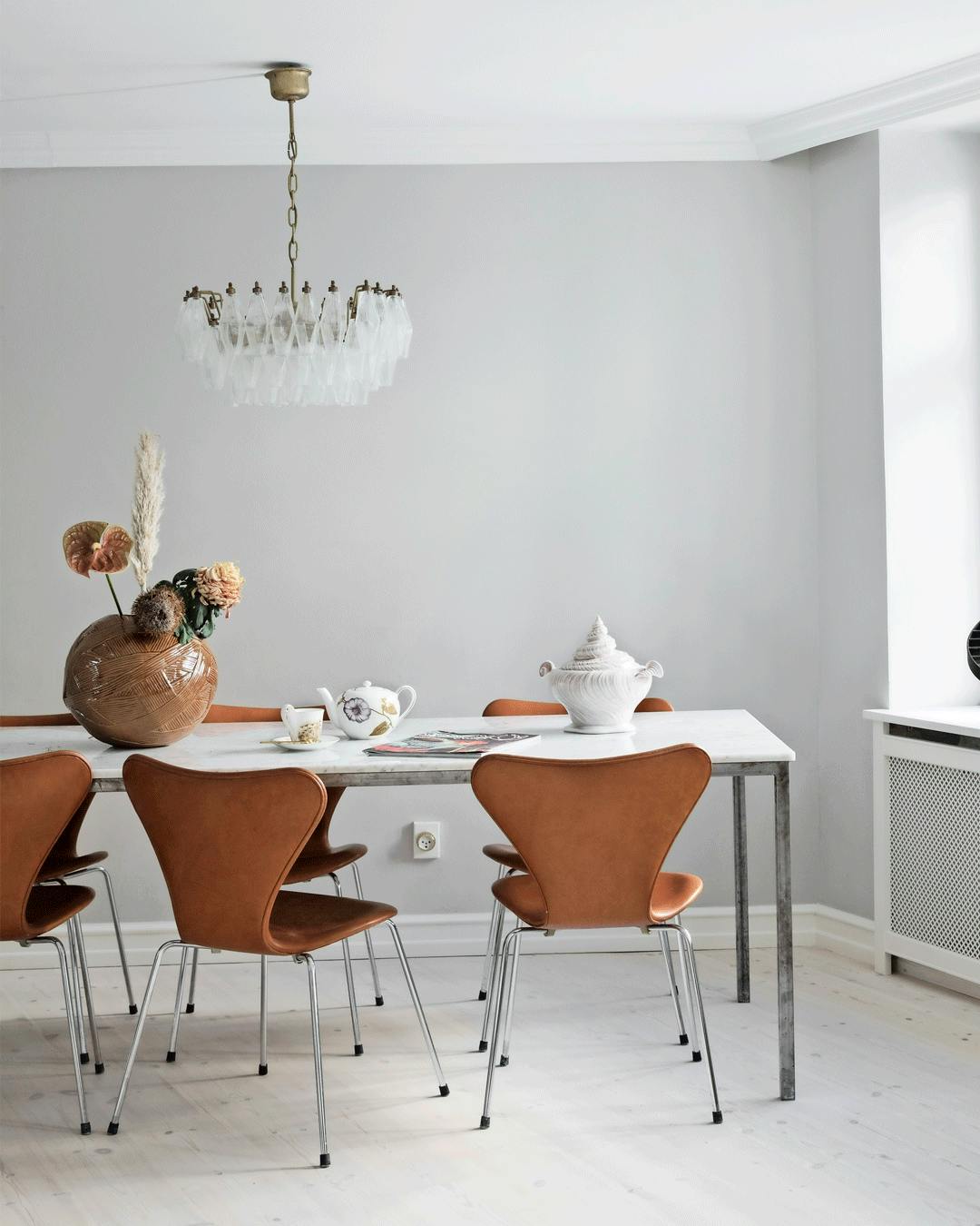Suppeterrinen formet som en konkylie designede Arje Griegst for Royal Copenhagen i 1978 som del af en serie. Stellet udgik i 1990'erne og er i dag et kostbart samlerobjekt. Lysekronen over spisebordet er fra Murano og lavet i 1950'erne. Det blomstrede stel er fra Royal Copenhagen, stolene er Arne Jacobsens 7'ere, og den store vase er fra Missoni Home.