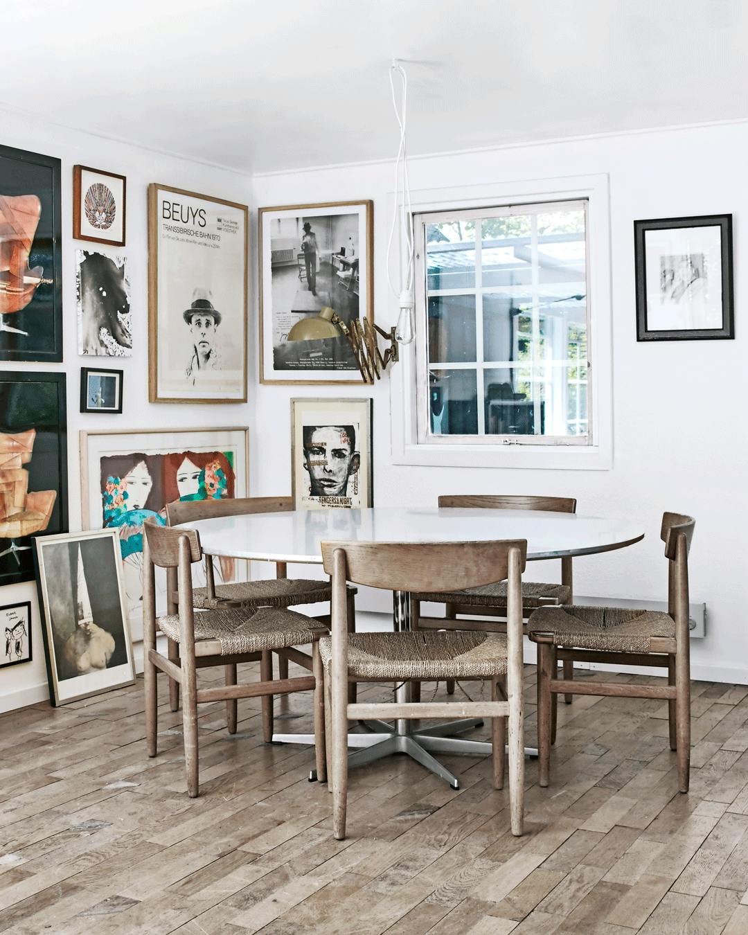 Giv din spisestue følelsen af et galleri, med en stor billedvæg. Hæng dine yndlings plakater og kunstværker op for at give din spisestue et mere personlig udtryk. Stolene i asketræ er Børge Mogensens Folkestol, mens det runde spisebord er designet af Piet Hein i samarbejde med Bruno Mathsson og Arne Jacobsen for Fritz Hansen. Væglampen er købt i Esthers Garage i Tisvildeleje.