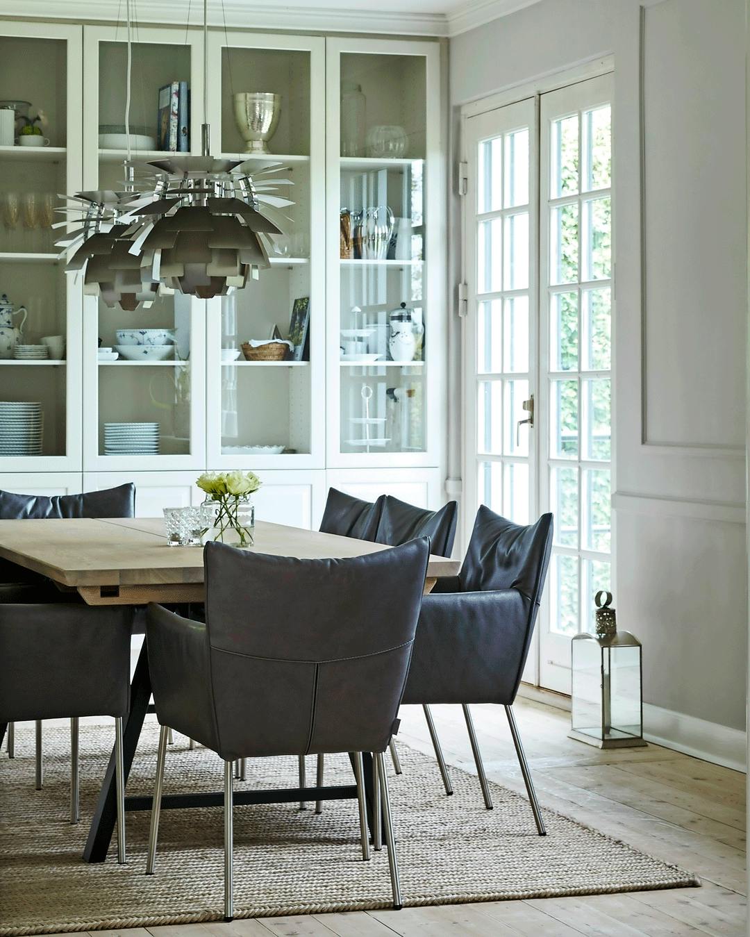Et stort væg til væg-skab med glaslåger får rummet til at virke større og er samtidig en god måde at vise dit pæne stel frem på. Lad det gerne gå helt til loftet, så det fungerer som en skabsvæg. Spisebordsstolene er fra Label. Gulvtæppet er fra Dekoform, og lamperne designet af Poul Henningsen er fra Louis Poulsen.
