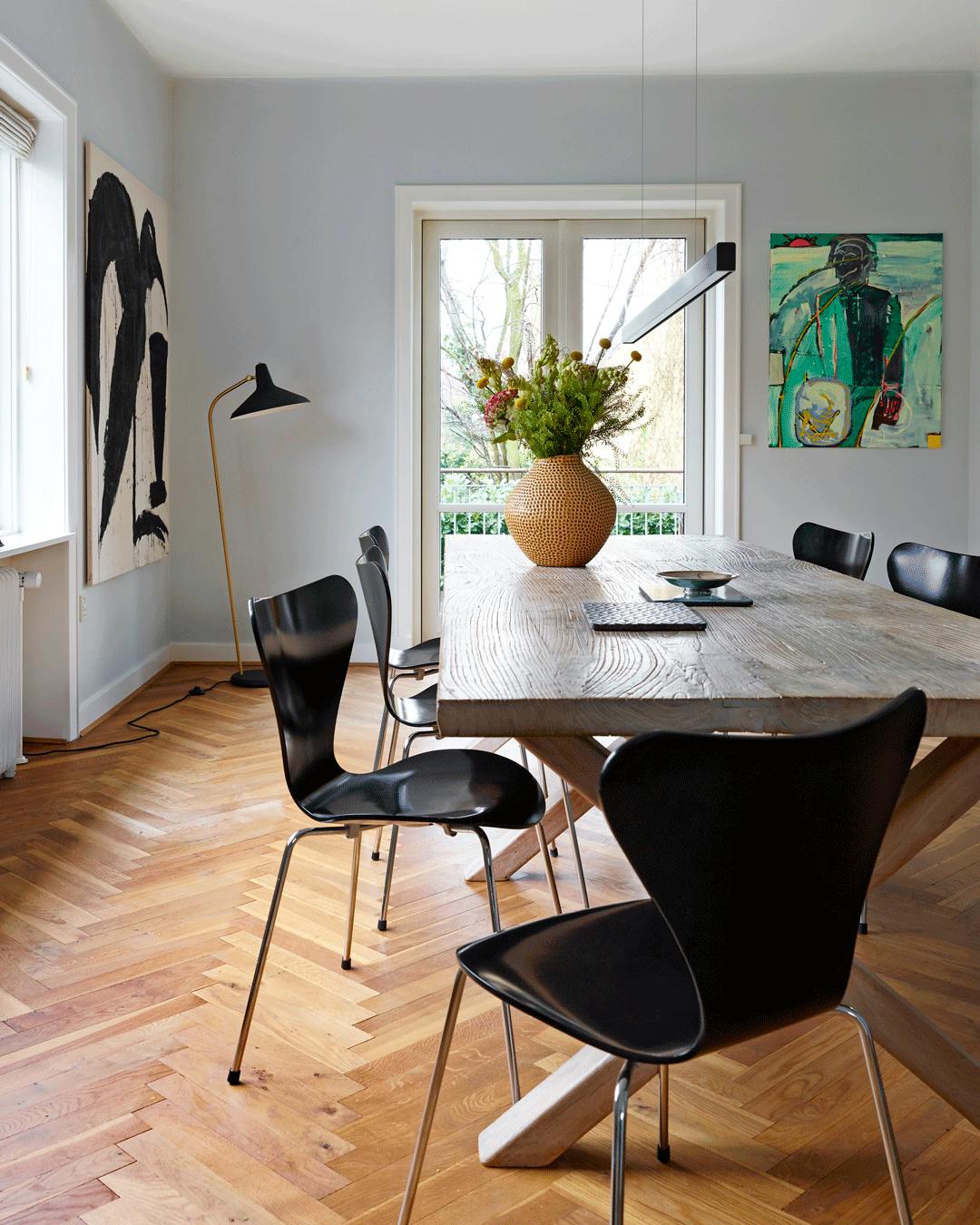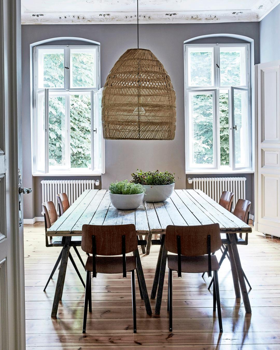 Giv herskabelige rammer kontrast med rustikke møbler såsom spisebordet her, der har en fortid som bod på et grøntsagsmarked. Spisebordsstolene er Model S16 fra hollandske Galvanitas og fundet brugt. Den flettede pendel over bordet er fra Tunesien.