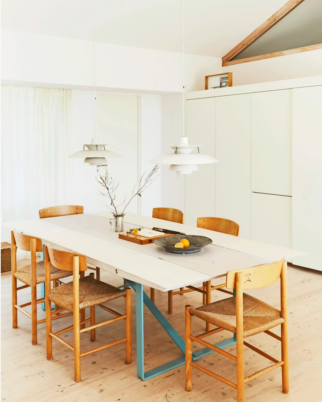 Med en enkel blå farve i spisestuen, gives der spil til de neutrale spisebordsstole med flet samt resten af rummet. Bordet i krydsfiner med sprøjtemalede stålben har boligens indehvaer Claus Bjarrum selv designet. Spisebordsstolene er Børge Mogensens J39 – eller Folkestolen – fra Mogensens tid som leder af FDB's møbeltegnestue.